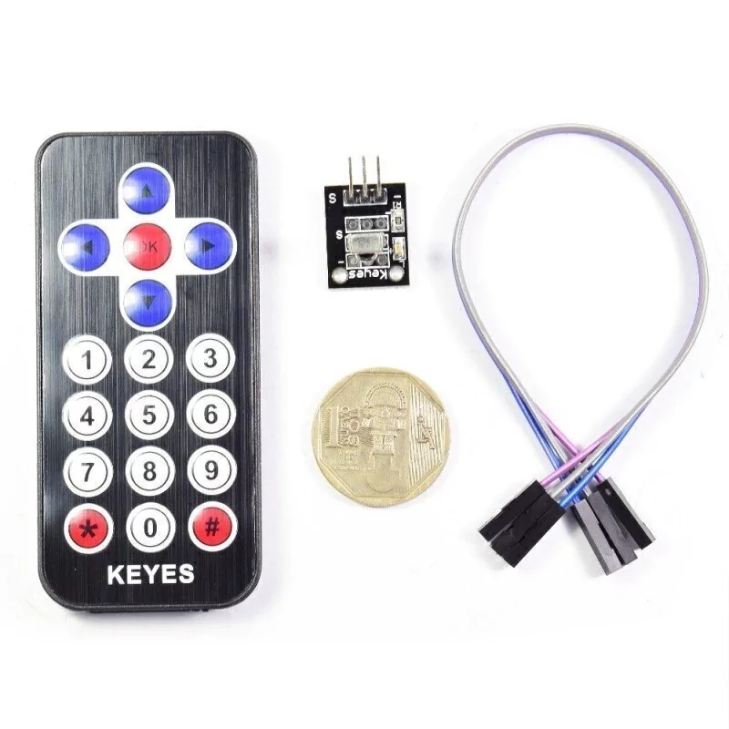 El Kit de control remoto inalámbrico por infrarrojos para Arduino consta de un control remoto por infrarrojos y un módulo receptor infrarrojo de 38KHz. El control remoto tiene 17 teclas de función, disparando una distancia de hasta 8 metros, ideal para el manejo de una variedad de equipos en la habitación.