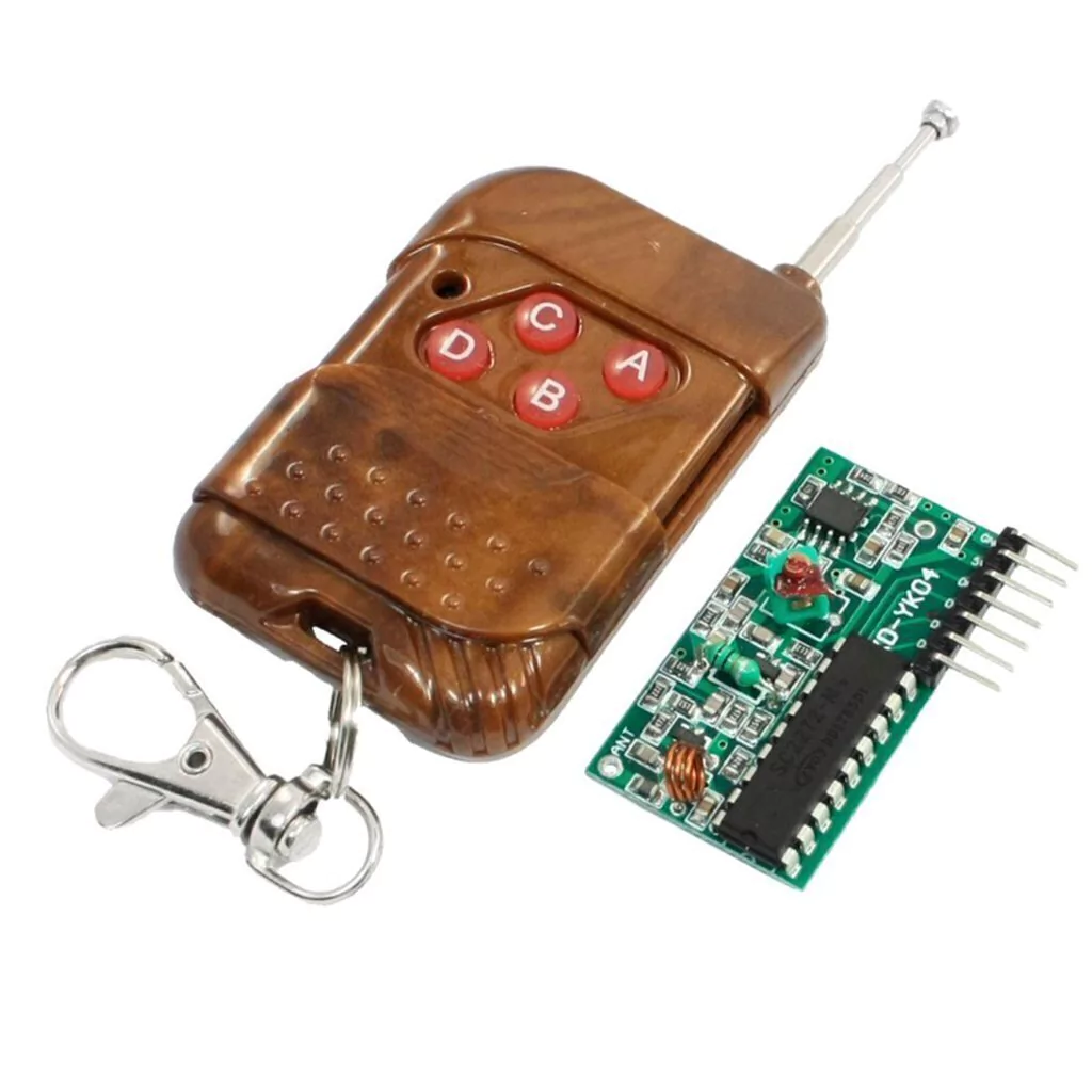 El control remoto RF posee 4 pulsadores, cada pulsador se corresponde con uno de los bits del receptor (D0, D1, D2 y D3). Cuando se presiona un pulsador, el control transmite la señal de activación del bit correspondiente, y el voltaje en el bit del receptor se eleva a 5V. Cuando se deja de presionar el pulsador, la salida del receptor retorna al estado de reposo de 0V.