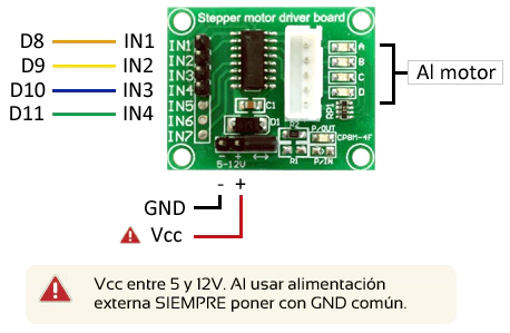 Esta placa basada en el ULN2003A permite amplificar las señales PWM y digitales del Arduino a voltajes y corrientes de un valor adecuado para controlar un motor paso a paso de 4 fases. El ULN2003A puede manejar hasta 25V y 0.5A por cada salida.