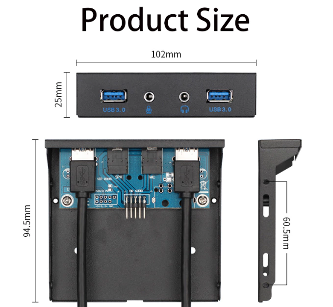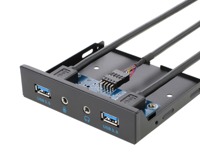 Este front puede ser instalado en una bahía de 3.5'' del gabinete de su computadora fácilmente. Proporciona 2 puertos USB 3.0 de alta velocidad, 1 Salida De Audio y 1 Entrada de Micrófono.